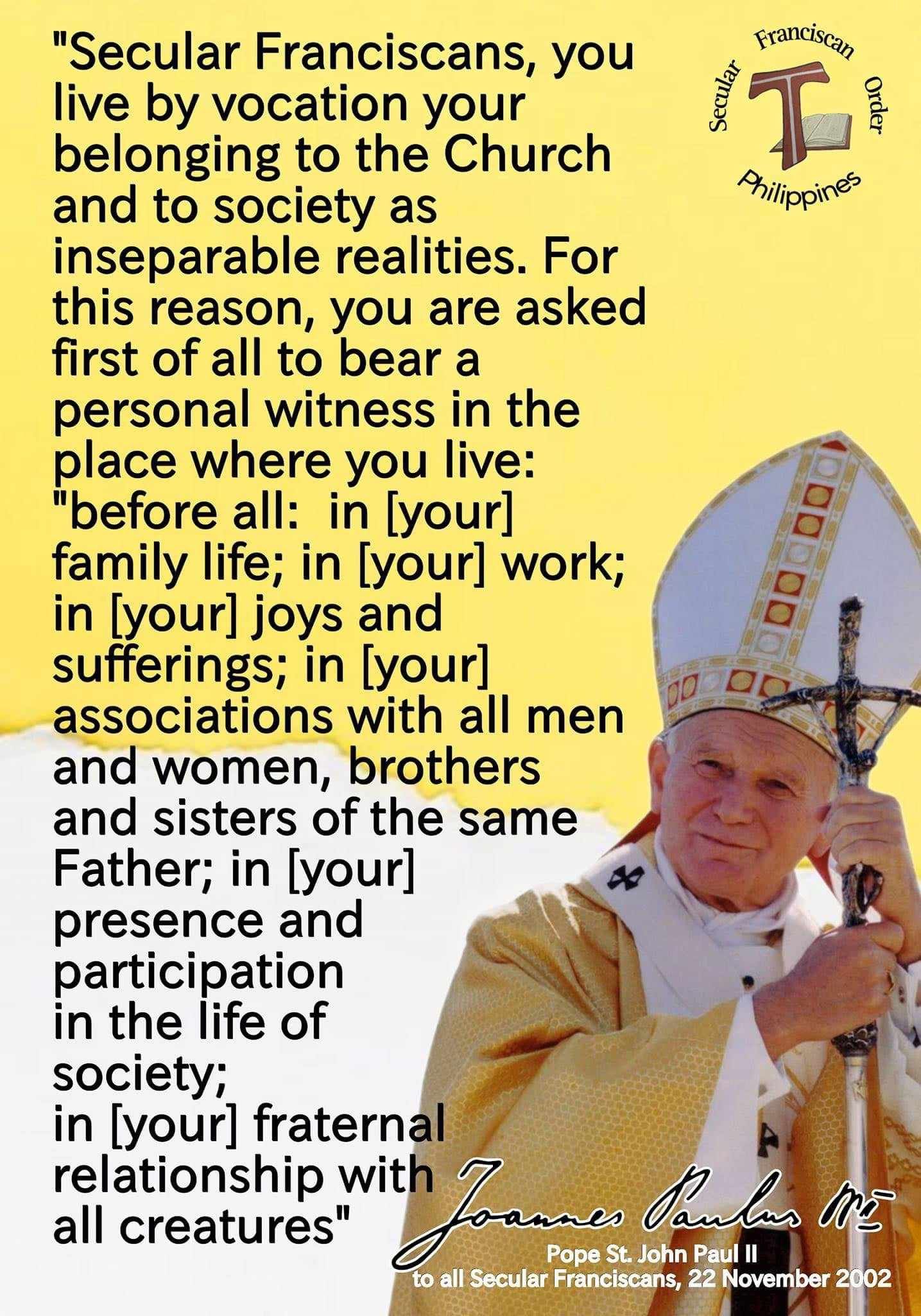 On Sunday, October 22nd, we celebrated the feast day of our beloved Pope, Saint John Paul II. The OFS in the Philippines, made this wonderful display, (left, or top, depending on media used). The yellow/white background is the Vatican flag.